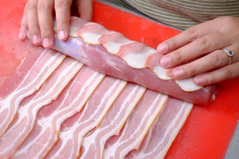 Vezměte pěkný kousek svíčkové a očistěte ho. Položte na pracovní plochu dostatek plátků slaniny na obalení masa, plátky se musí překrývat. Začněte na jedné straně a postupně zabalte panenku do slaniny.